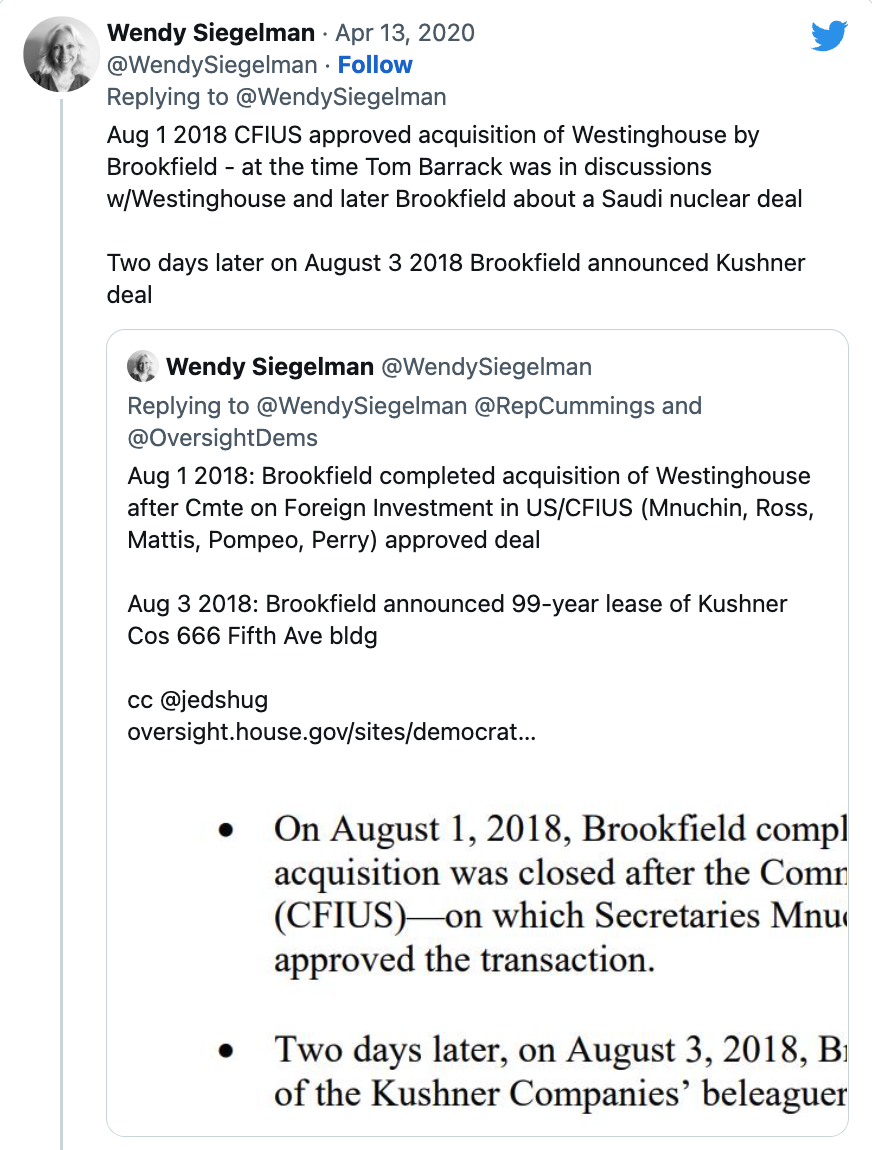 Note that there is no indication that the discussions between Softbank and Mubadala about the sale of Fortress have any connection to the Fortress deal to finance Kushner Companies. However if both deals close this will become yet another deal in which Jared Kushner’s work while in the White House has overlapped with the financial partnerships that have benefitted him or his family.